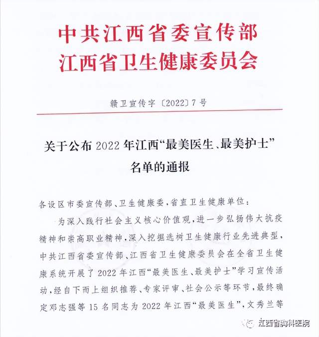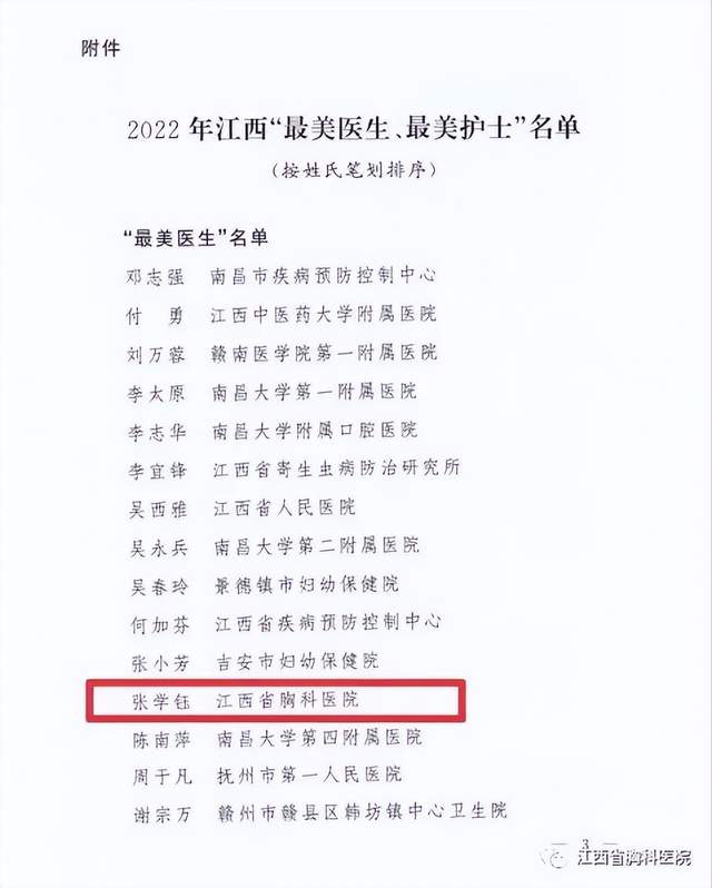 近日,由江西省委宣传部、江西省卫生健康委员会联合开展的2022年江西“最美医生、最美护士”学习宣传活动公布入选名单,江西省胸科医院结核二科负责人张学钰成功入选,获评“2022江西最美医生”。
