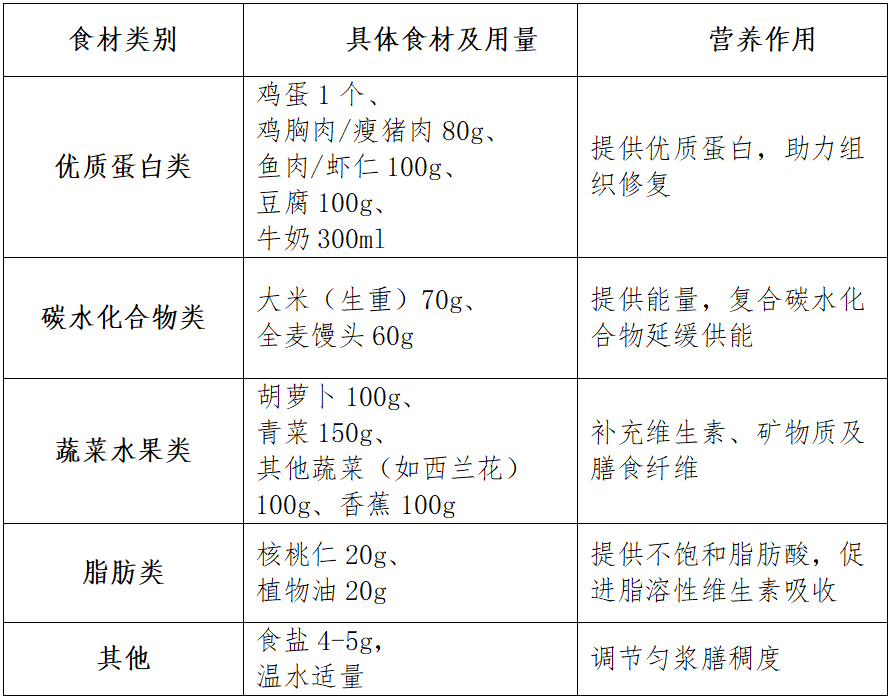 4.高蛋白配方匀浆膳。用于营养不良、术后恢复期、肿瘤等需要增加蛋白质摄入的患者,蛋白质占比提升至25%-30%,原料以优质蛋白(如鸡蛋、牛奶、瘦肉、鱼虾)为主,助力组织修复和免疫力提升。
