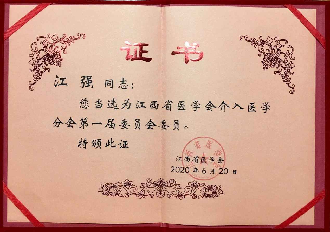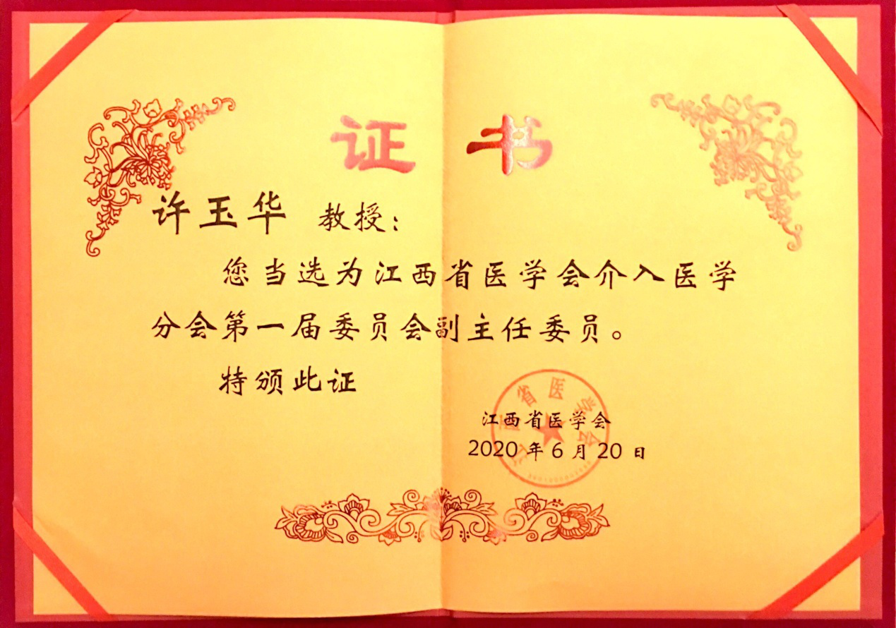 2020年6月20日,由江西省医学会主办的江西省医学会介入医学分会成立大会在英雄城南昌顺利召开。会议选举产生了江西省医学会介入医学分会第一届委员会,江西省胸科医院介入血管科负责人、副主任医师许玉华当选为副主任委员,主治医师江强入选委员。