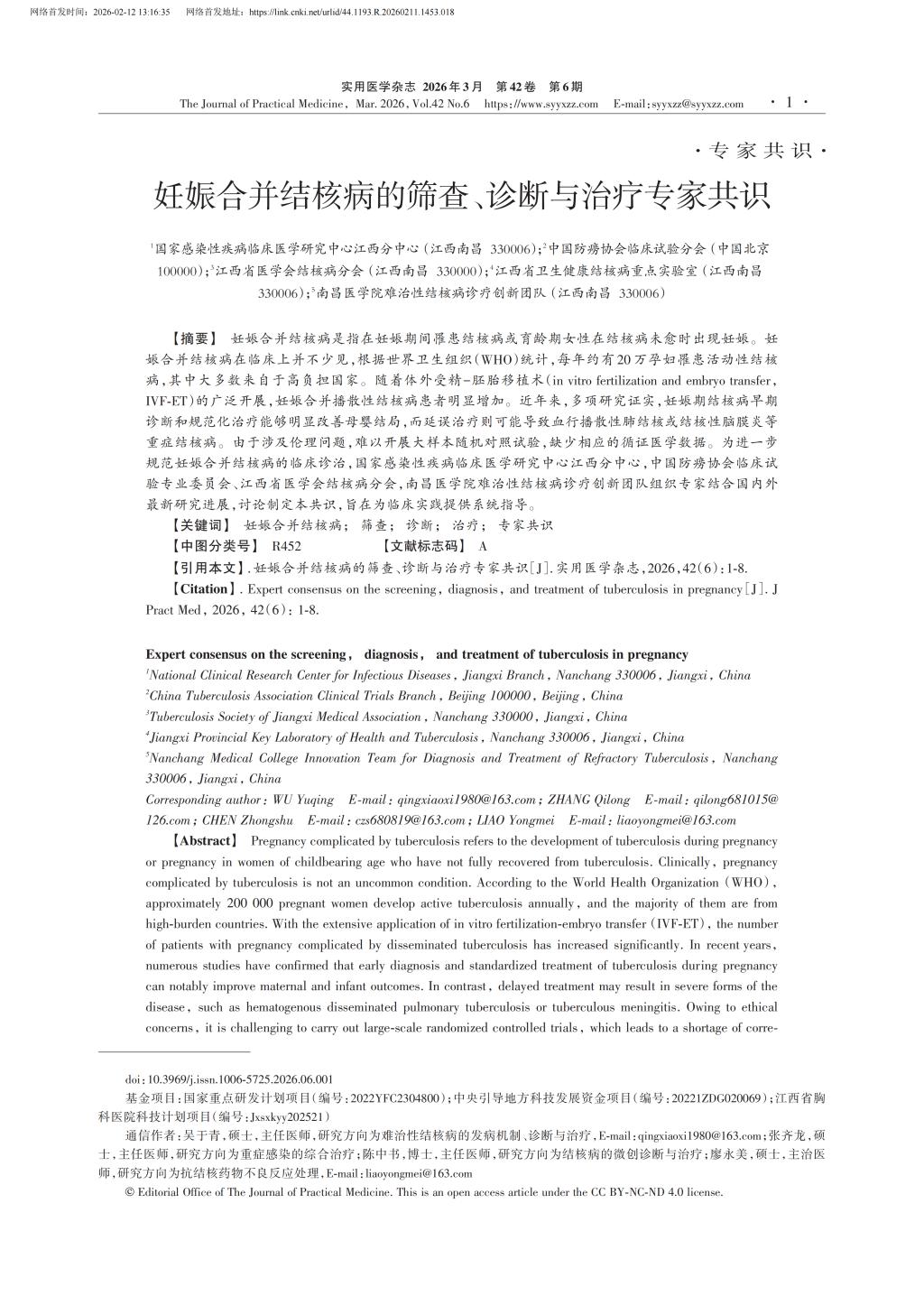 近日,由国家感染性疾病临床医学研究中心江西分中心、江西省胸科医院(南昌医学院第三附属医院)牵头,联合中国防痨协会临床试验分会、江西省医学会结核病分会、江西省卫生健康结核病重点实验室及南昌医学院难治性结核病诊疗创新团队共同撰写的《妊娠合并结核病的筛查、诊断与治疗专家共识》在北大核心期刊《实用医学杂志》正式发布。