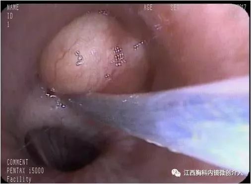 硬质气管镜下行左上支气管肿瘤套切+冷冻治疗: