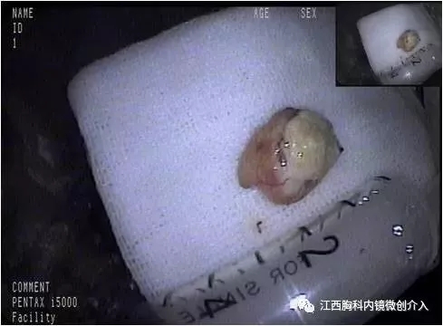 气管镜发现:左上肺支气管开口可见类球形新生物。