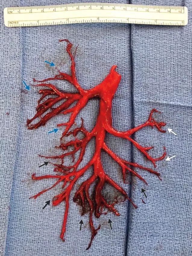 “一名36岁的加州男子最近因心悸住院后咳出了部分肺。在加护病房的第一周,他经常咳出血和痰,但一次咳嗽比一次更厉害。他咳出了右支气管树的一块完整的碎片,这片完整的支气管树有一些导管,将空气输送到肺部。是的,他咳出了一部分肺。”